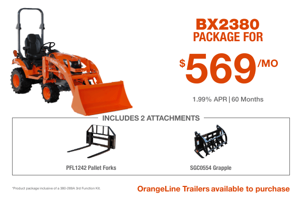 Now’s the time to take home the #1-selling tractor in the Midwest. This Kubota BX2380 package comes equipped with: